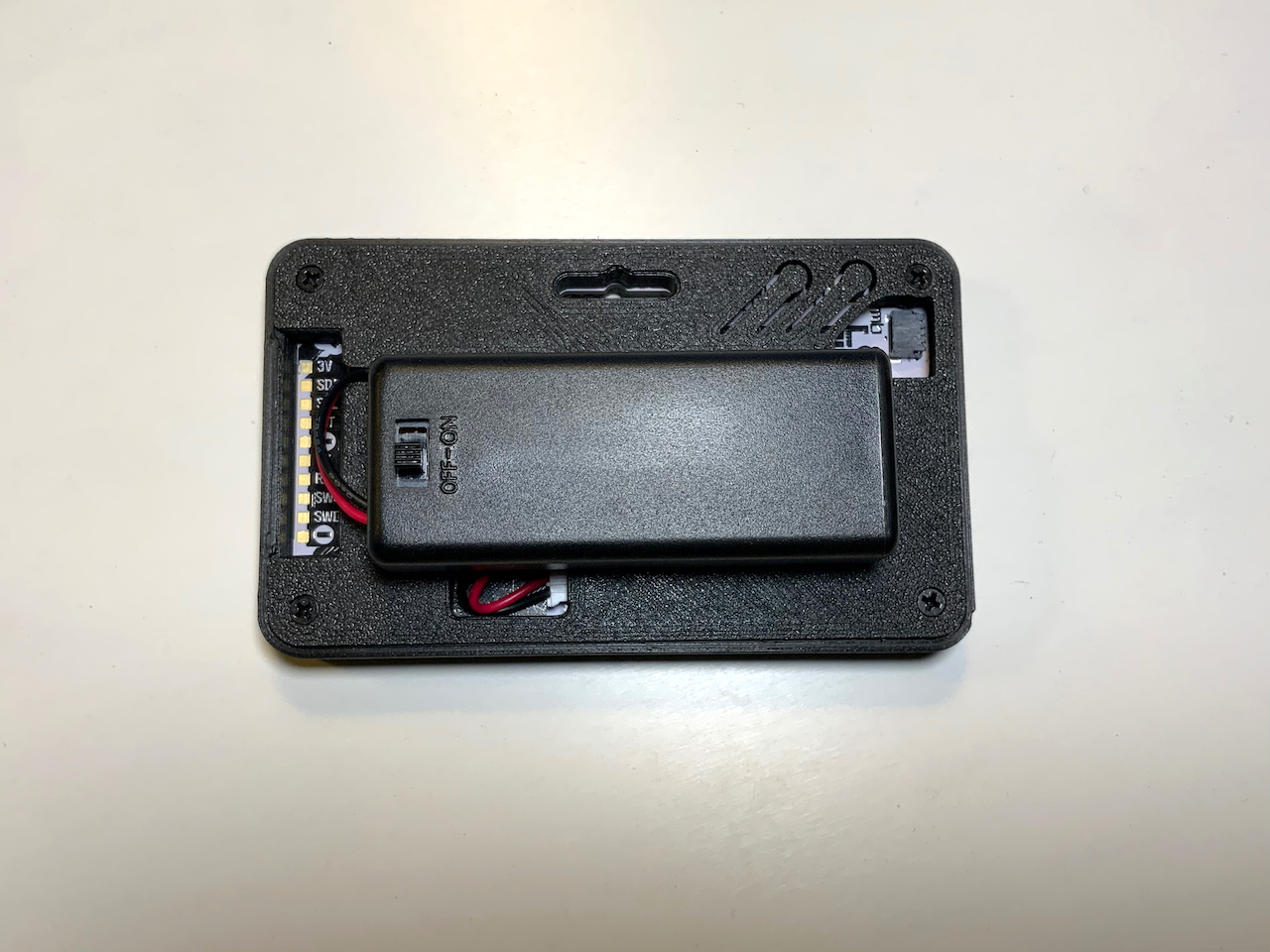 All connections are still accessible. Any cables you might want to connect can be routed to the centre of the back of the badge. This way you have one place where all the cables come out. In combination with the magnets, the badge can be used as a display for all kinds of projects. Of course, you can still use the badge as a badge, because the hole for the strap is also there. I especially like the barely visible buttons on the front of the badge.