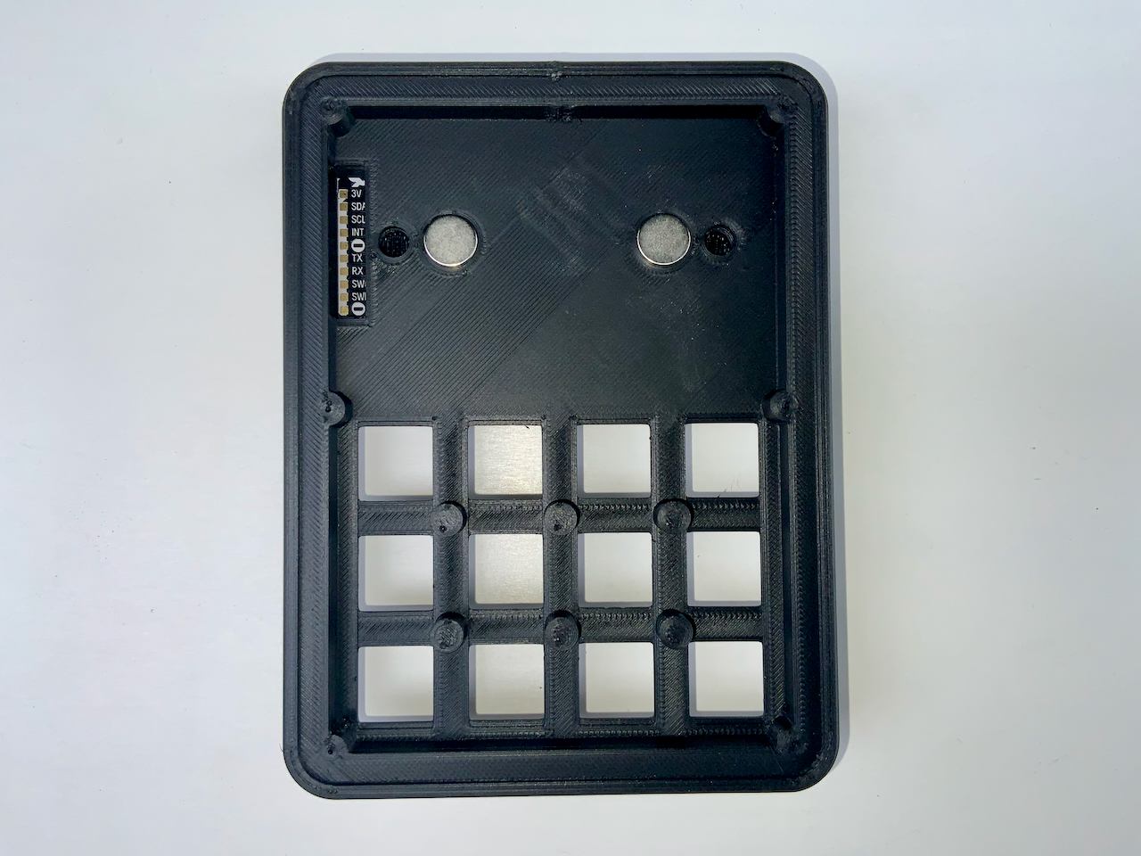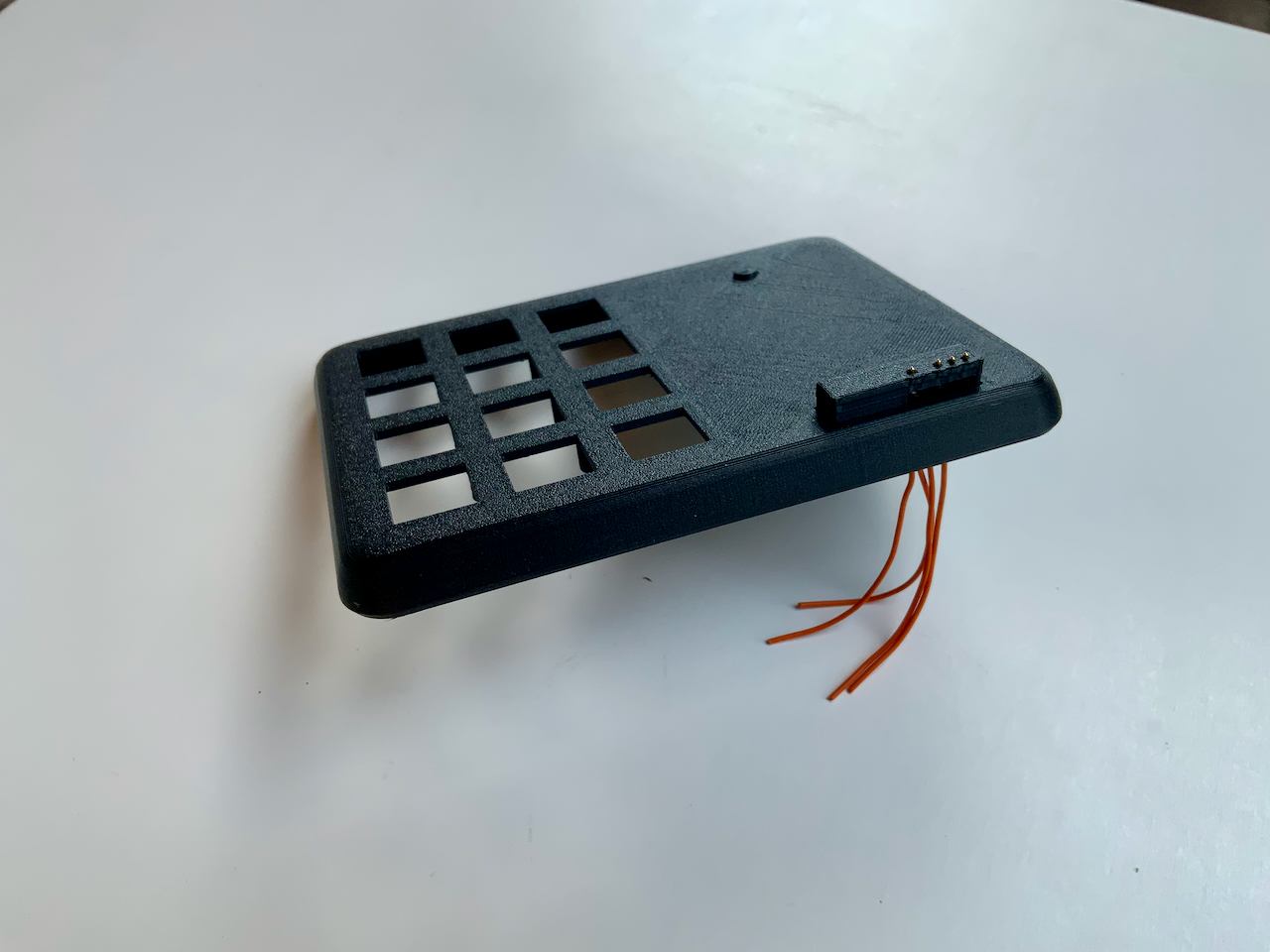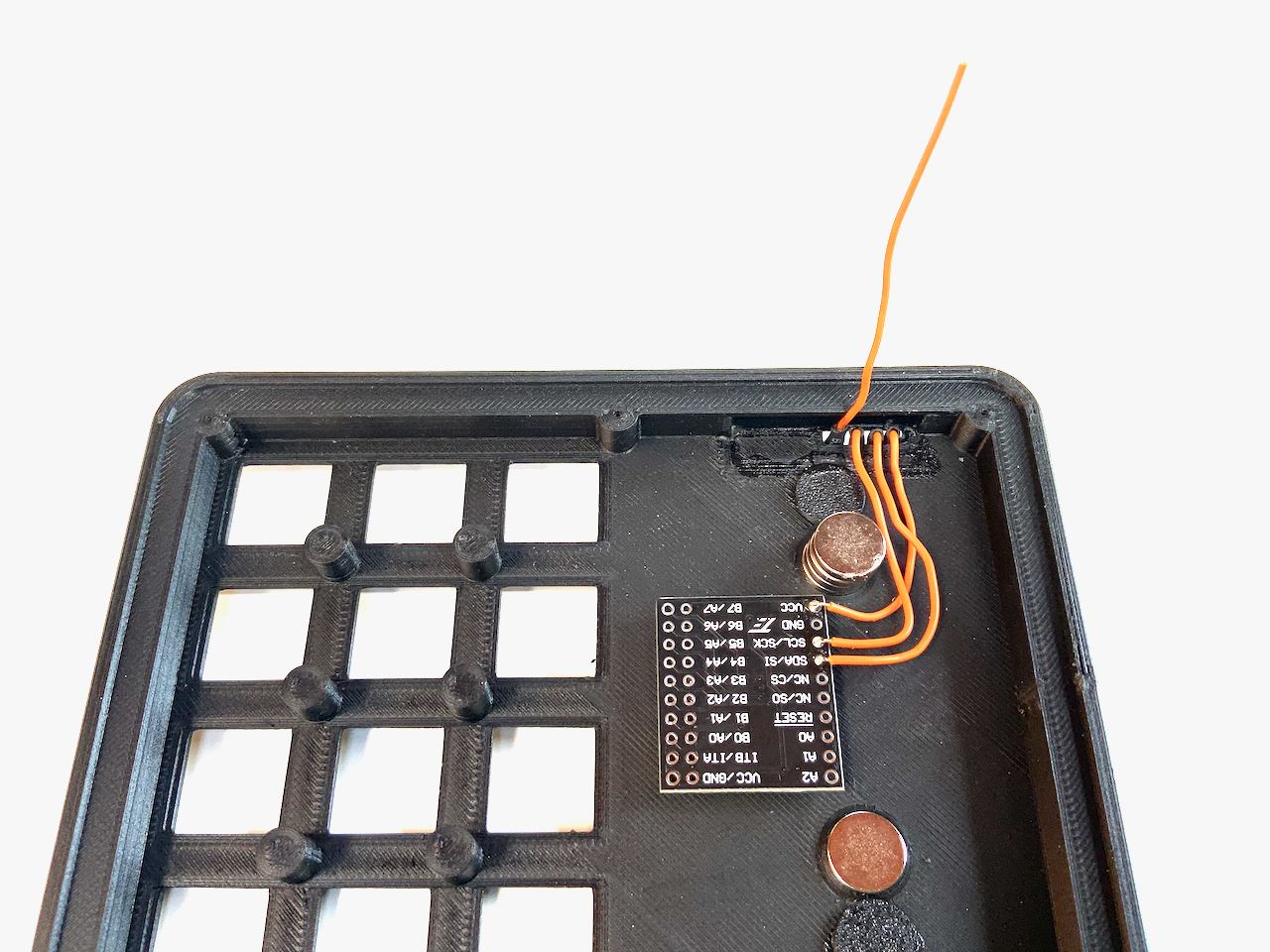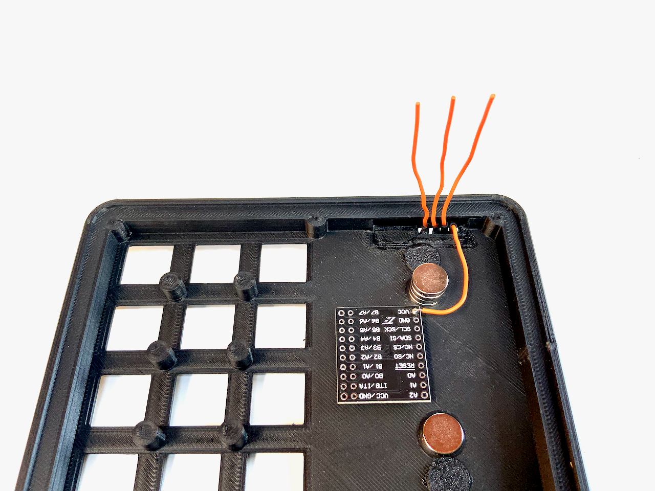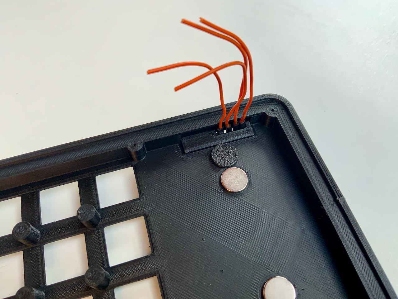 I know they are a bit expensive. You can also build the keyboard without the Pogo pins, and just use a cable with a Qwiic connector instead. In that case, the cable is fed through the connector hole and plugged into the socket on the back of the badge. If you want to do it this way, you don't need to print Connector.stl. But I recommend the variant with the Pogo Pins, because the Qwiic socket on the badge is not meant to be plugged in and out all the time. The socket can easily be damaged and it is not so easy to detach the badge from the keypad.