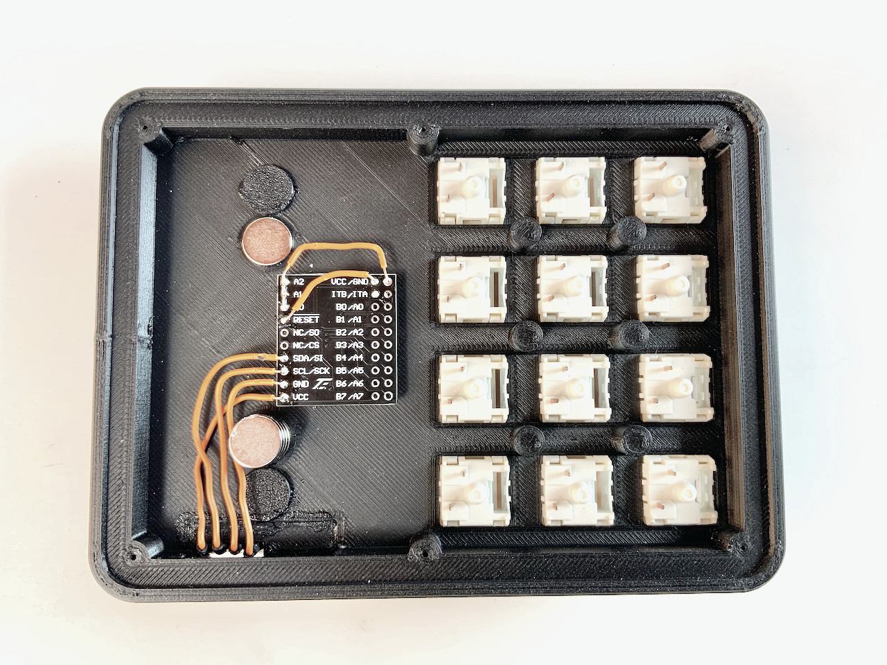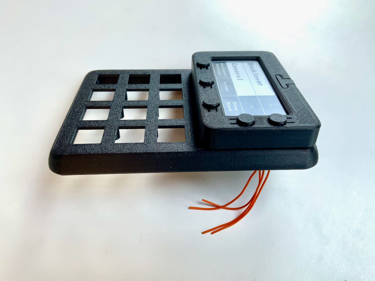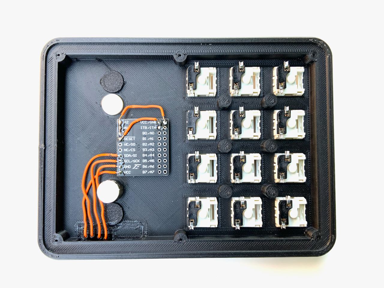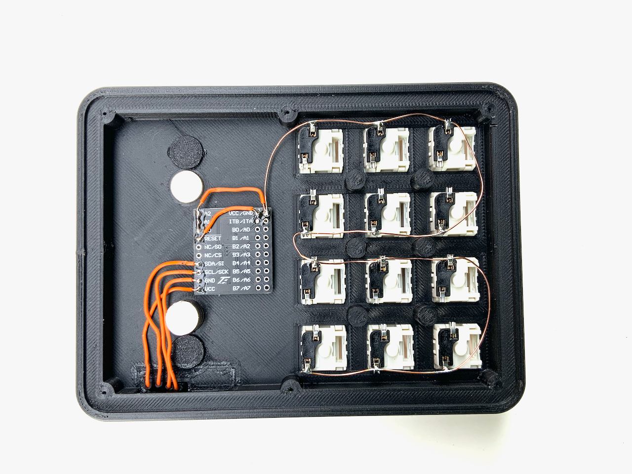 If you need more keys than the five on the badge, and you have a 3D printer, then I have something for you: an extension with 12 mechanical keys. You can use regular sized MX-keys (right picture) as well as the low profile keys from Kailh (left picture). The whole thing is wired by hand, but it's really easy to make.