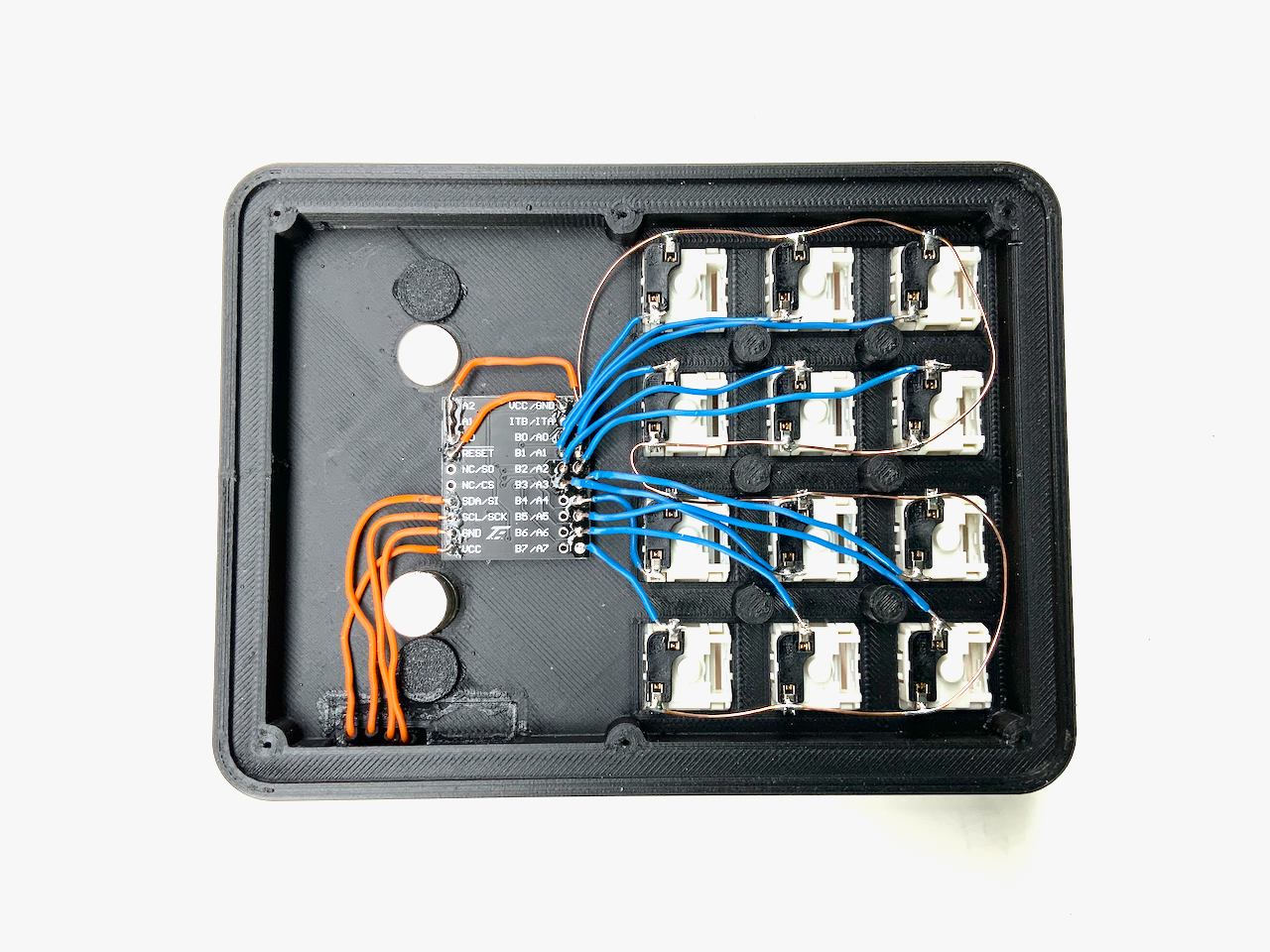 This firmware is designed to make the wiring as simple as possible. For example: the keys don't have to be connected to specific input pins of the MCP23017 in order to match a certain key arrangement (you can use all inputs except the last four: B4, B5, B6 and B7). This makes it easier to build handwired keyboards, because you can connect any key to any pin, as long as you use the pins you specified in the firmware.