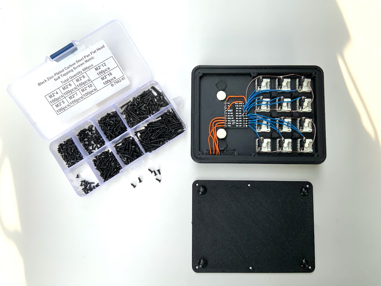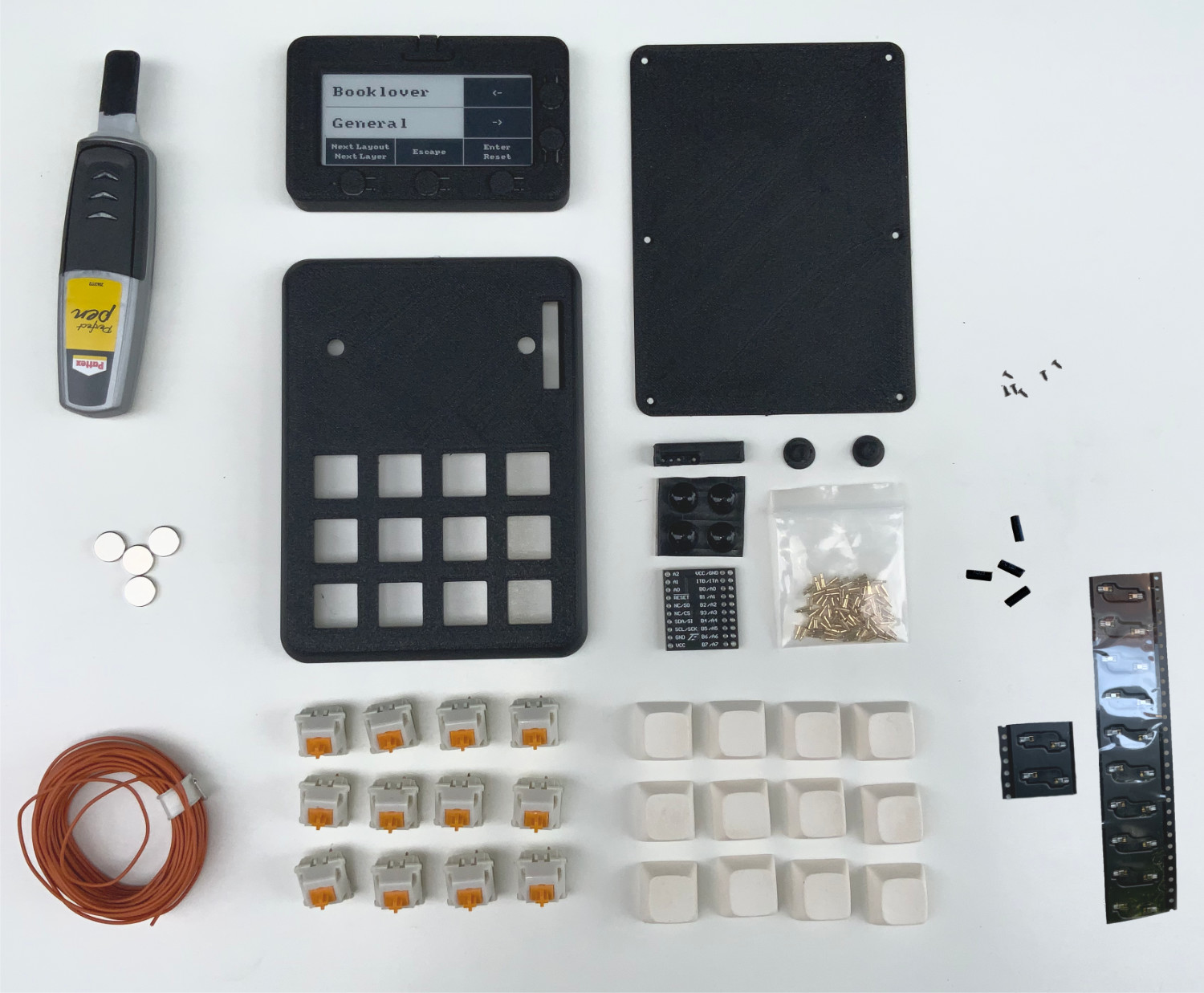 You need twelve mechanical keys. Both MX-style keys and low profile keys from Kailh fit into the keypad. And also twelve matching keycaps in the color of your choice. You don't necessarily need them, but I recommend key sockets, so you can change the keys later. They also make it easier to solder the cables to the keys, because they have a larger soldering area. I order my keys, keycaps and sockets here: