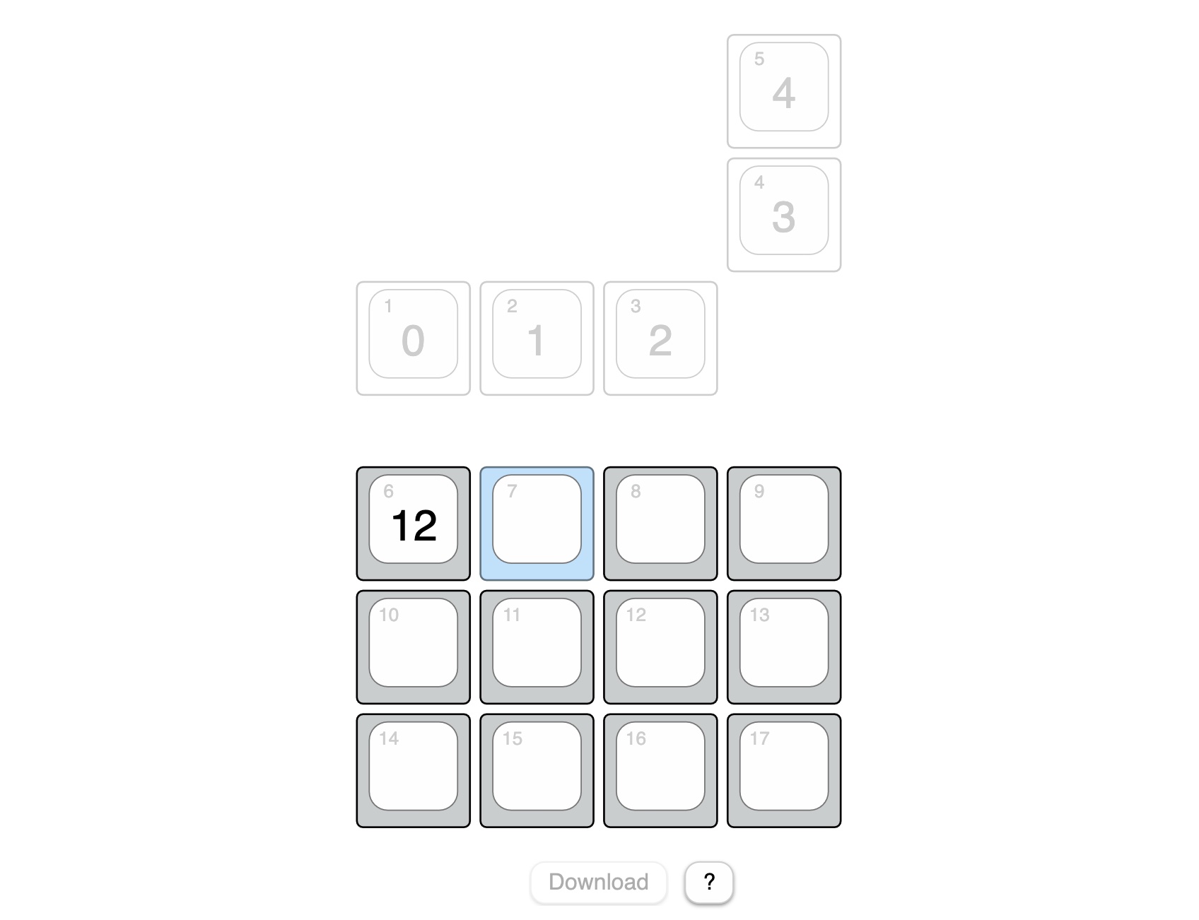 The recorded hardware key number is now visible at the center of the key (12). Then the next key is highlighted. Continue until you have pressed all the keys. You can always select a key with the mouse to change incorrect entries. When you have pressed all the keys, click the Download button. This will save a mapping.js file in your downloads folder. Copy this file to your keyboard.