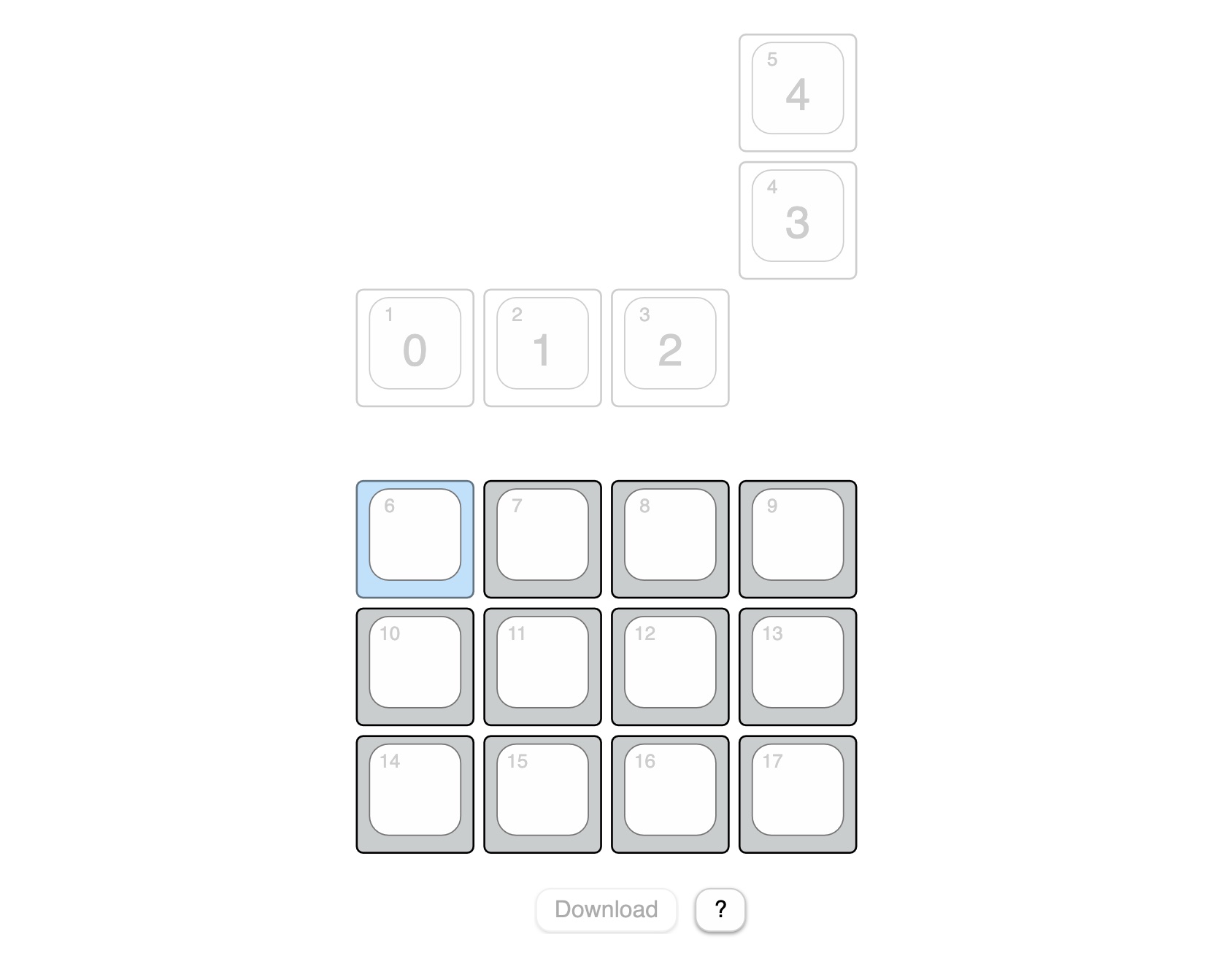 These are all the keys on the Badger 2040 when it is attached to the keypad module. The small number in the top left corner is the key number which is used inside the layout definition file (layout.js). The grayed-out keys built in to the badge have a fixed mapping that cannot be changed. They are displayed for reference purposes only. To map the hardware key numbers to the numbers used in layout.js, press the key on your keypad that is highlighted in blue.