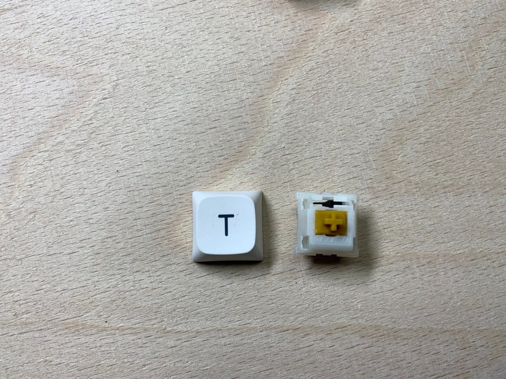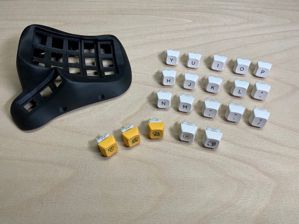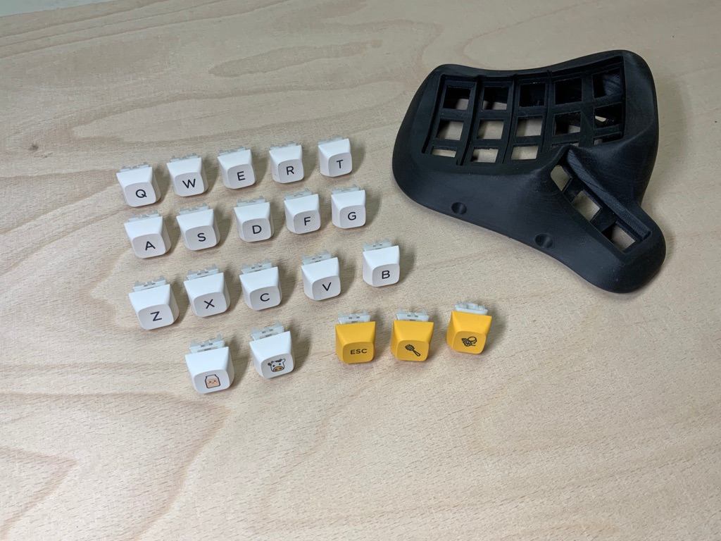 Put the keycaps on the 40 keys. If you have labeled keycaps, make sure the slot in the keycaps is on top.