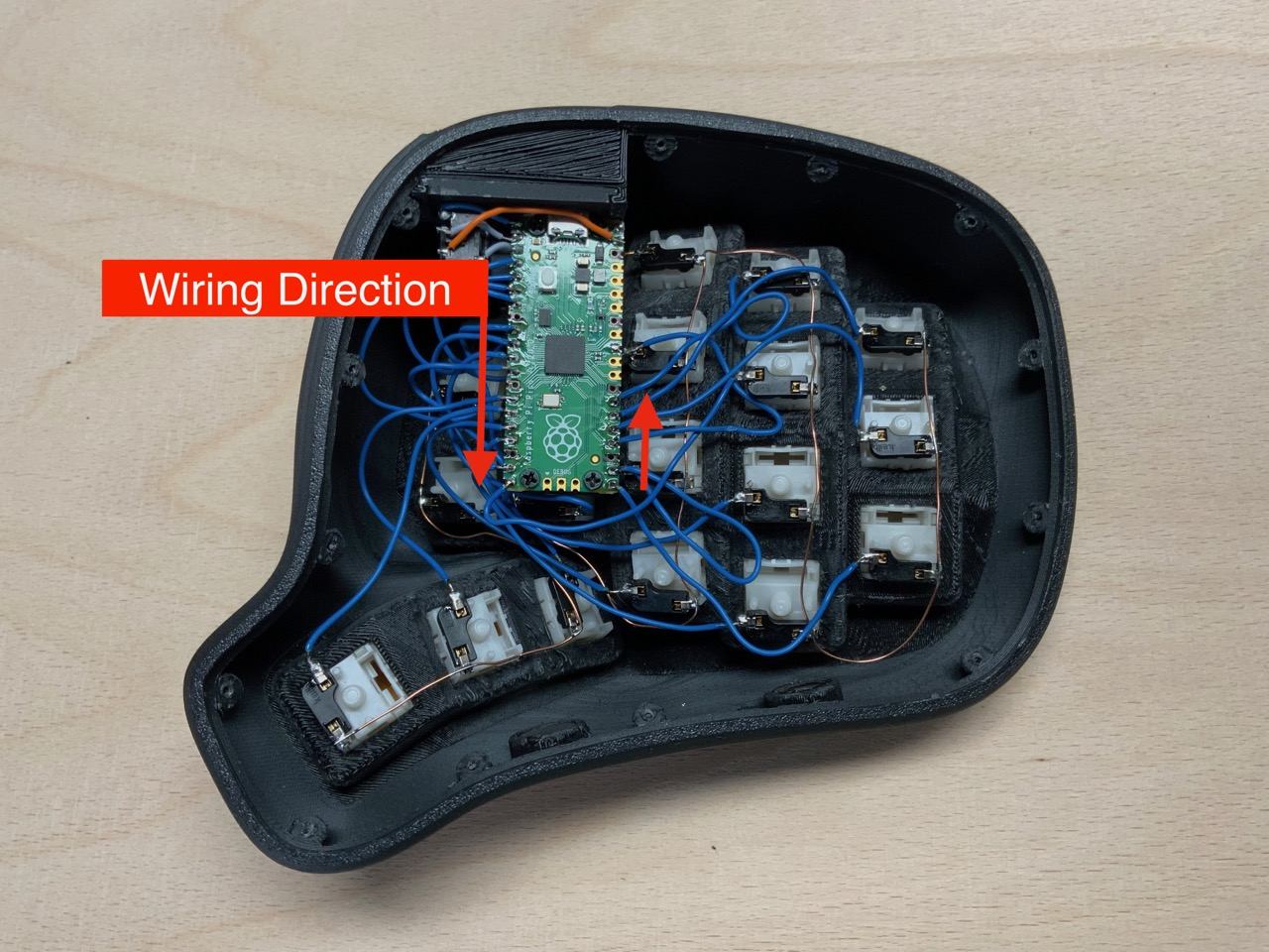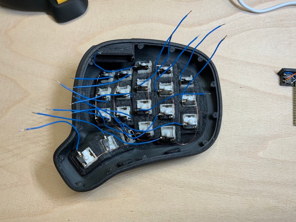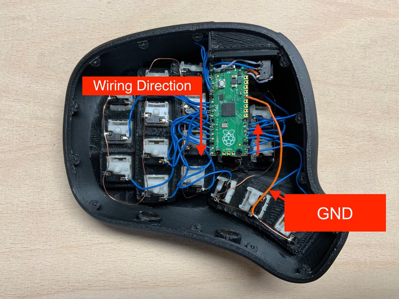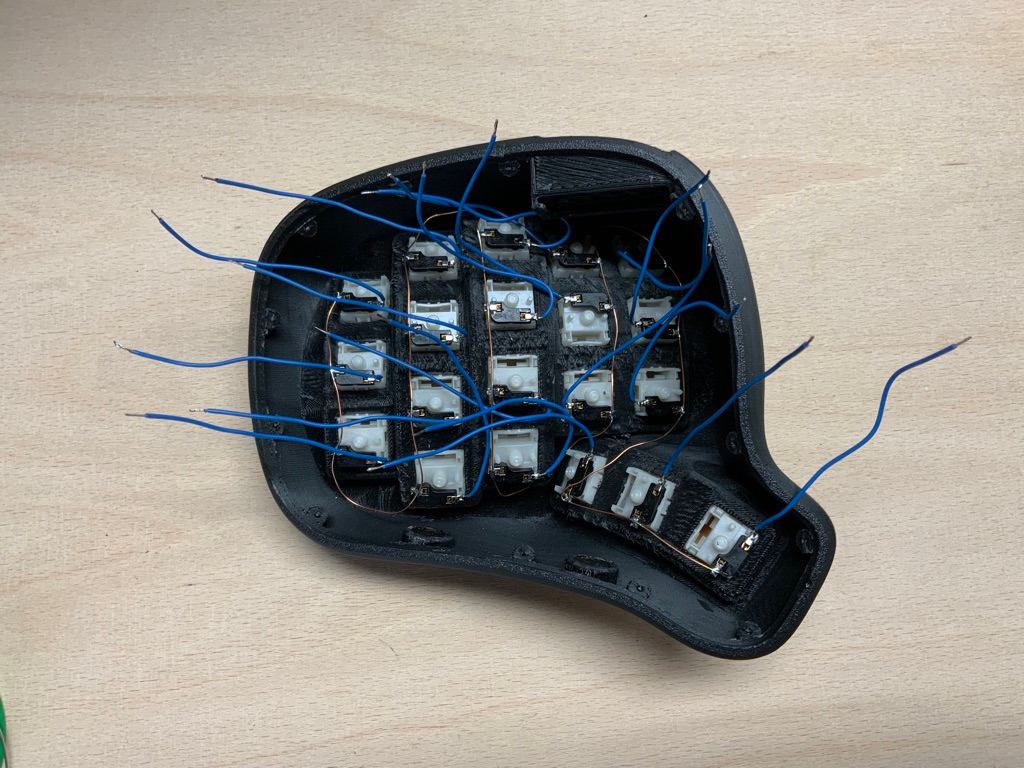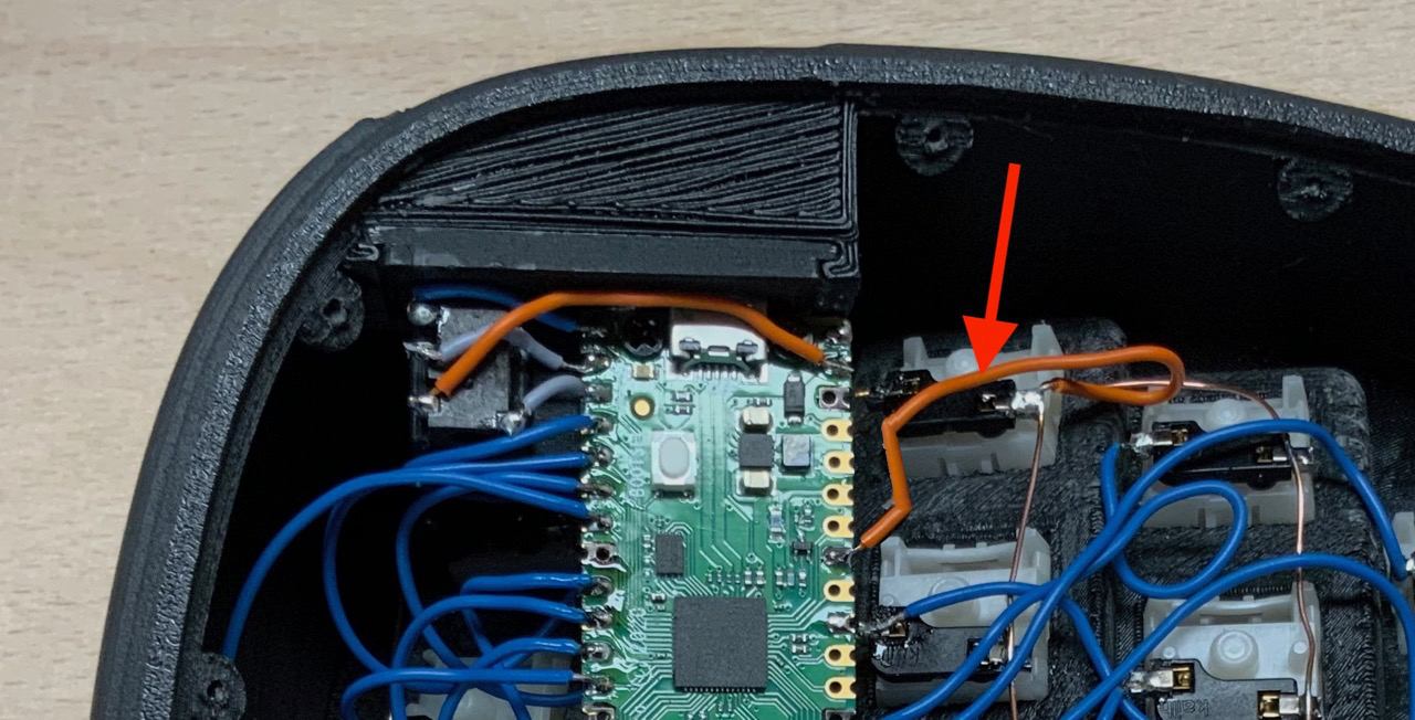Solder and connect one pin of each switch with this cable. Think about the cable routing so that the cable does not touch the microcontroller.