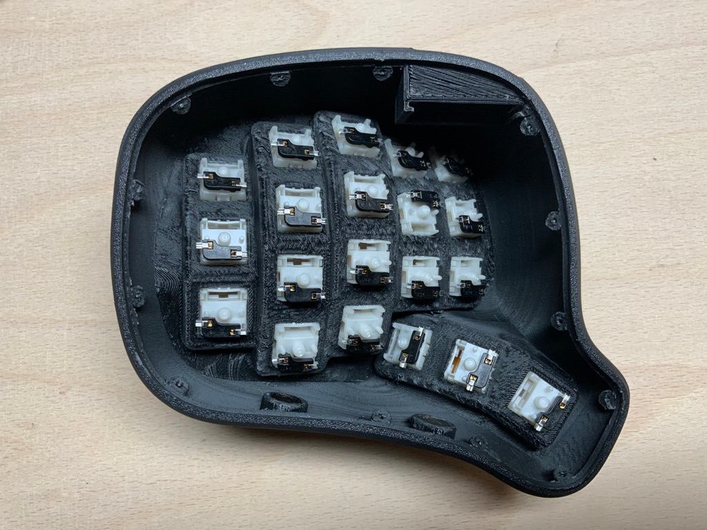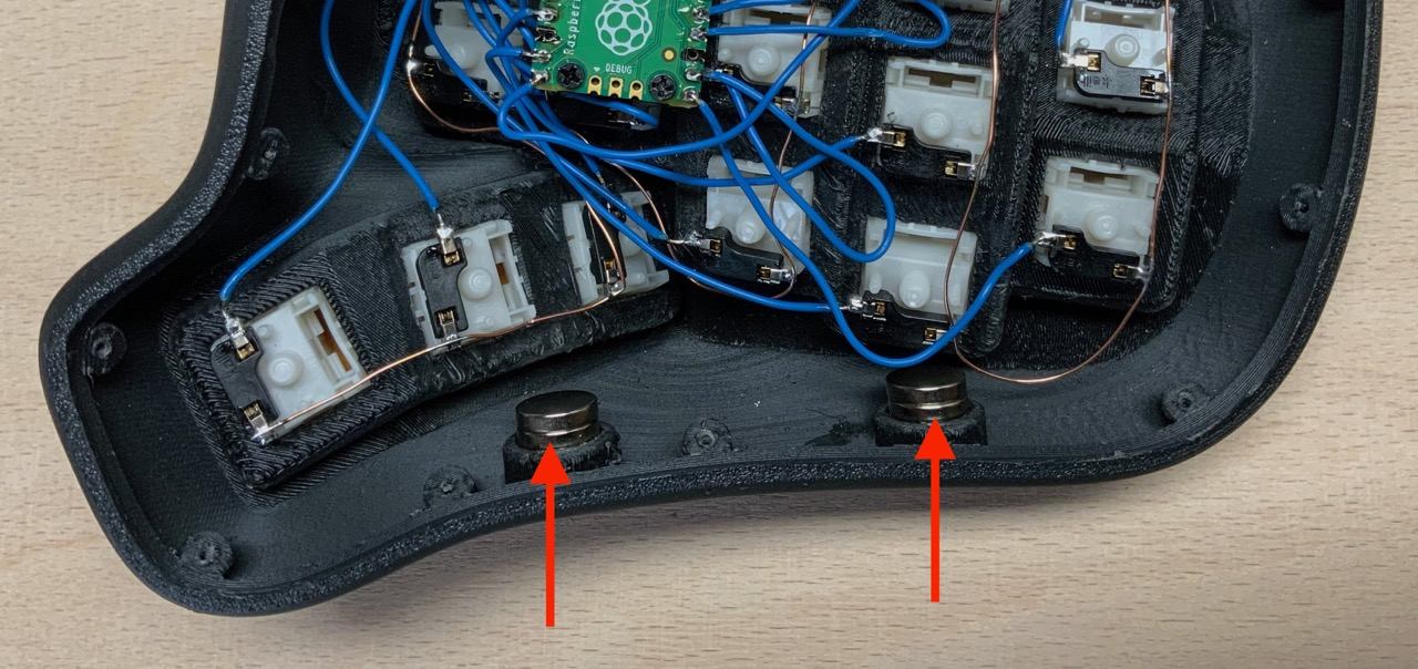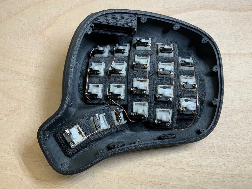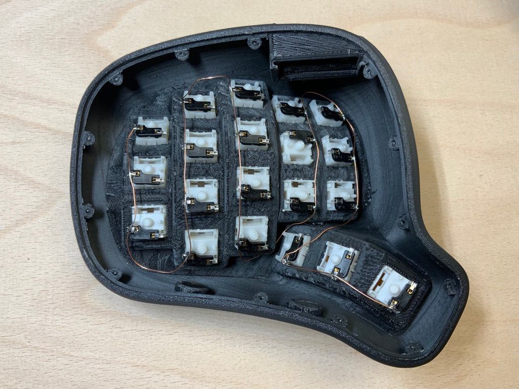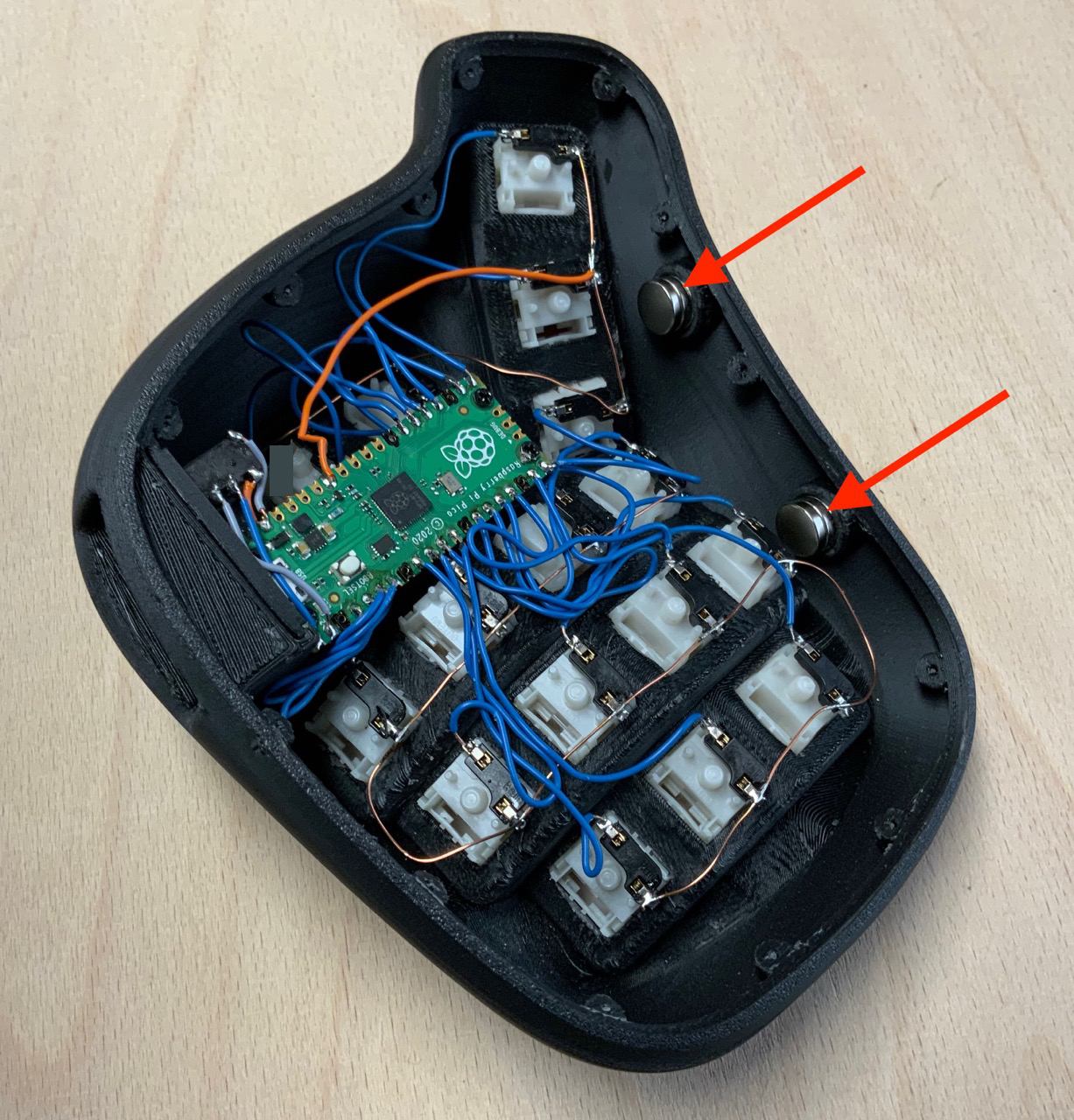 Solder and connect one pin of each switch with this cable. Think about the cable routing so that the cable does not touch the microcontroller.